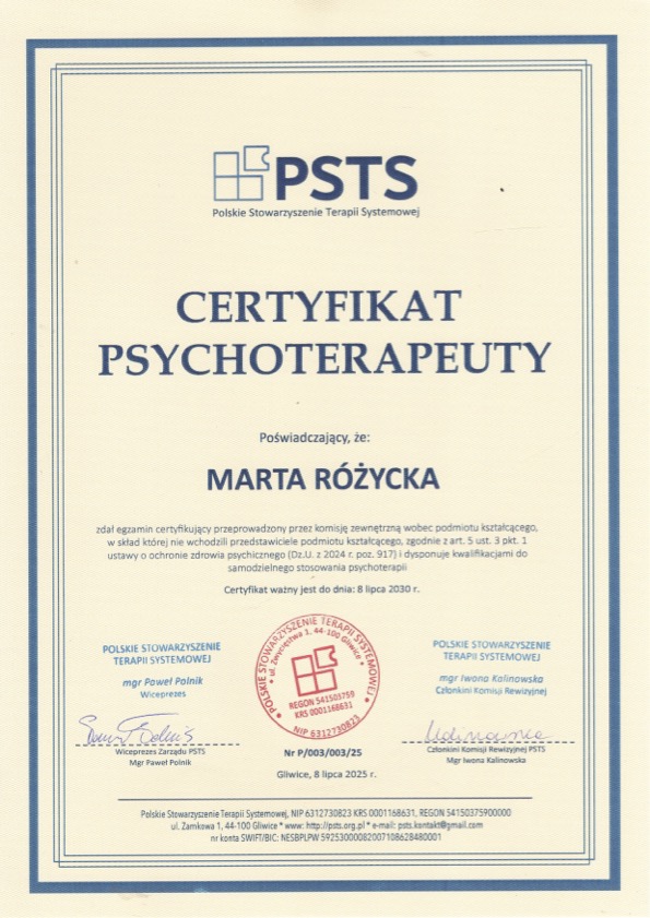 Psychoterapeuta certyfikowany to osoba, która ukończyła wieloletnie szkolenie specjalistyczne w zakresie psychoterapii, spełniające określone standardy. Certyfikacja psychoterapeutów stanie się w Polsce standardem. Mgr Marta Różycka posiada następujące certyfikaty: Certyfikat Psychoterapeuty (PSTS SP/003/003/25 ważny do dnia 8 lipca 2030 r.) Certyfikat Psychotraumatologa (PSTS SP/003/003/25 ważny do dnia 8 lipca 2030 r.) Certyfikat Superwizora Psychoterapii (PSTS SP/003/003/25…